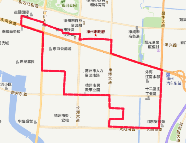 線路走向:會(huì)展中心-德政路-康博大道-東風(fēng)東路-晶華大道-太陽(yáng)湖路-康博大道-沙王小學(xué)-新河?xùn)|路-岳莊大街-國(guó)防路-廣川大道-東風(fēng)東路-東七街-星凱路-趙辛路-天玉路-趙辛路-長(zhǎng)河大道-德政路-會(huì)展中心。