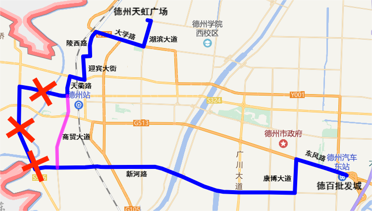 運(yùn)營(yíng)路線:德百批發(fā)城、東風(fēng)路、康博大道、新河路、商貿(mào)大道、天衢路、迎賓大街、青年路、陵西路、大學(xué)路、湖濱大道、德州天虹廣場(chǎng);臨時(shí)取消:德州面粉廠宿舍、魏莊社區(qū)、三里莊社區(qū)、德州市第二實(shí)驗(yàn)小學(xué)、嘉恒小區(qū)、帝景城家園等6站;臨時(shí)新增:鑫苑小區(qū)、鳳凰雅苑、熙鳳居、商貿(mào)大道水廠路、糧食物流中心、石家園小學(xué)、時(shí)代花園、新港灣小區(qū)、商貿(mào)大道三八西路等9站。