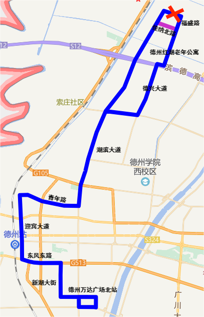 運(yùn)營(yíng)路線:德州萬(wàn)達(dá)廣場(chǎng)北站、東地大街、新河路、湖濱大道、新建路、新湖大街、東風(fēng)路、迎賓大街、青年路、湖濱大道、佳納北路、福盛路、德州紅湖老年公寓;