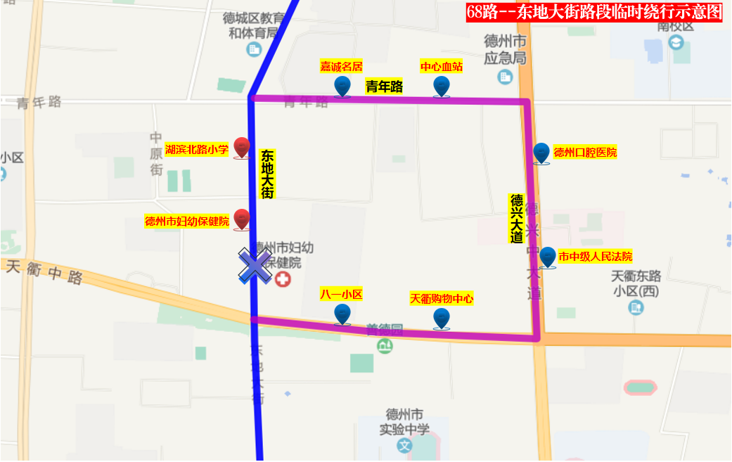 因東地大街(青年路至天衢路)道路施工,7月26日起,68路線在原繞行基礎(chǔ)上新增東地大街路段繞行,具體如下: