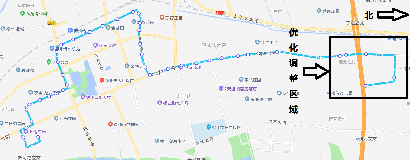 優(yōu)化調(diào)整后線路走向:德州萬達廣場北站—新湖大街—東風路—迎賓大街—青年路—湖濱大道—小李路—福盛路—德州紅湖老年公寓。