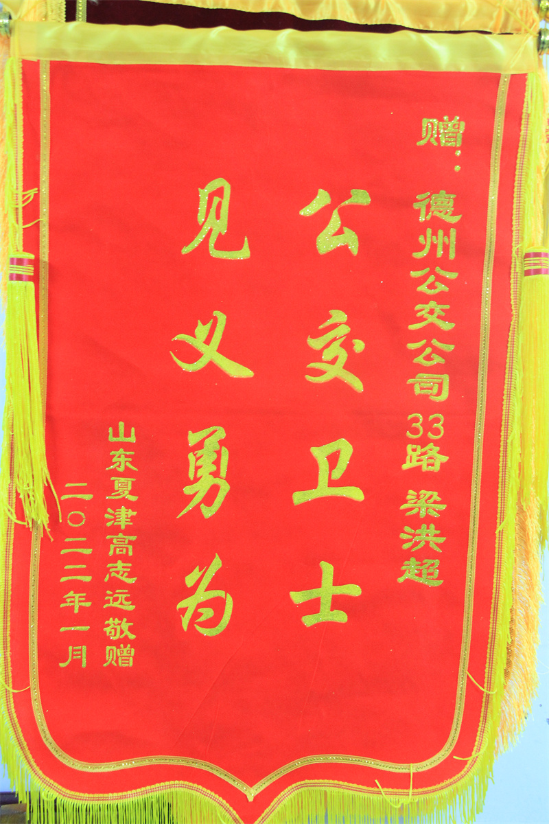 隔天,高先生來到一分公司辦公室找到了幫助他救火的33路駕駛員梁洪超,一邊感謝他的熱心幫助,一邊把一面印有“公交衛(wèi)士 見義勇為”的錦旗送到他的手中。