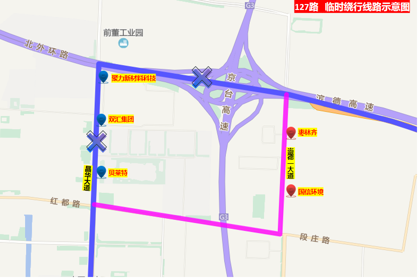 臨時取消:貝萊特、雙匯集團、聚力新材料科技、閆王張、避雪店、西孫莊、王英、大高家店、車莊、郝莊、李牌西、李牌東、岔河東、蘇家庵、方家莊西站、韓村、趙虎鎮(zhèn)方家莊等17站;