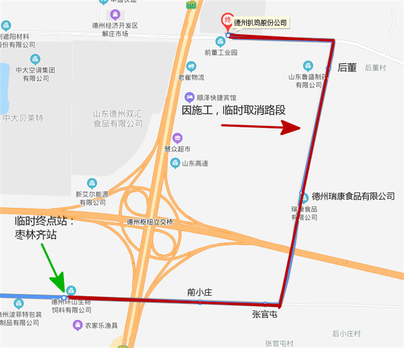 35路終點(diǎn)站調(diào)整至棗林齊,臨時(shí)取消前小莊、張官屯、德州瑞康食品有限公司、后董、德州扒雞股份公司站。