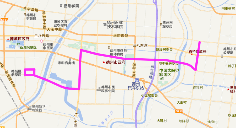 德州萬達廣場北站、湖濱南大道、新河路、廣川大道、東方紅路、崇德三大道、袁橋公交樞紐中心。