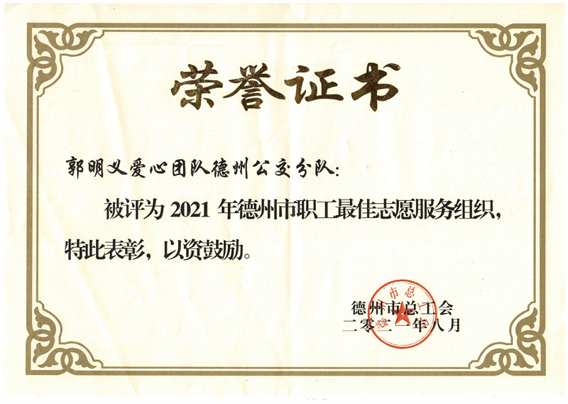 郭明義愛心團(tuán)隊(duì)德州公交分隊(duì)榮獲2021年德州市職工最佳志愿服務(wù)組織稱號