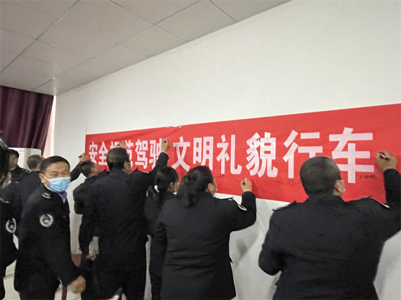 三、營造濃厚活動氛圍。駕駛員代表宣讀倡議書,全體車長聯(lián)合在倡議條幅上簽字。