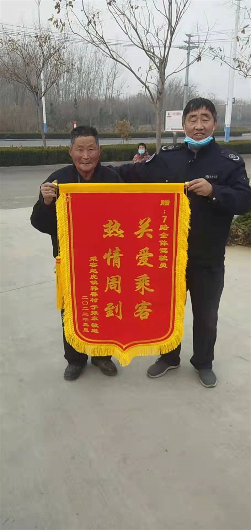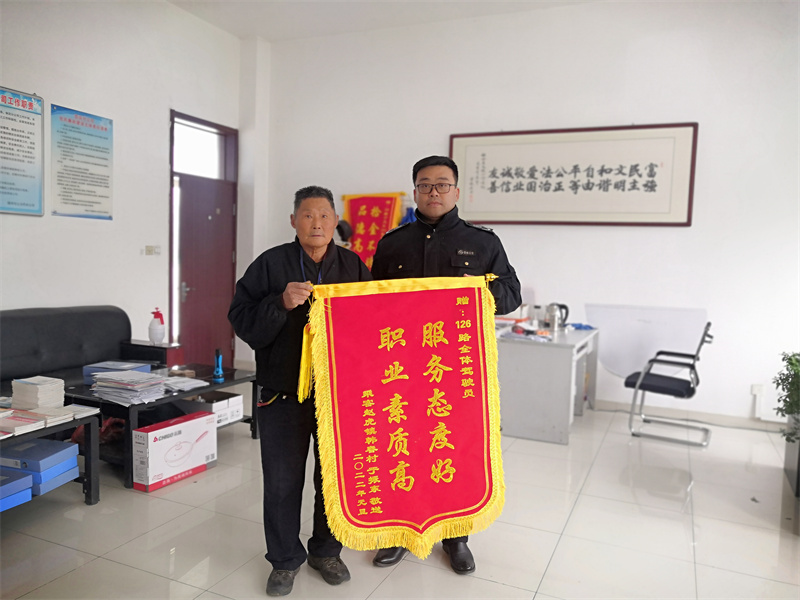 “感謝你們一直以來為我們乘客提供的安全、便捷、優(yōu)質(zhì)的公交服務,公交駕駛員們嚴謹細致的工作作風和熱情貼心的服務,讓我們很是感動?!?2月10日,來自趙虎鎮(zhèn)韓春村的于先生分別來到公司太陽谷公交場站和袁橋公交樞紐中心,將寫有“關(guān)愛乘客 熱情周到”“服務態(tài)度好 職業(yè)素質(zhì)高”字樣的兩面錦旗送到126路和7路駕駛員手中。