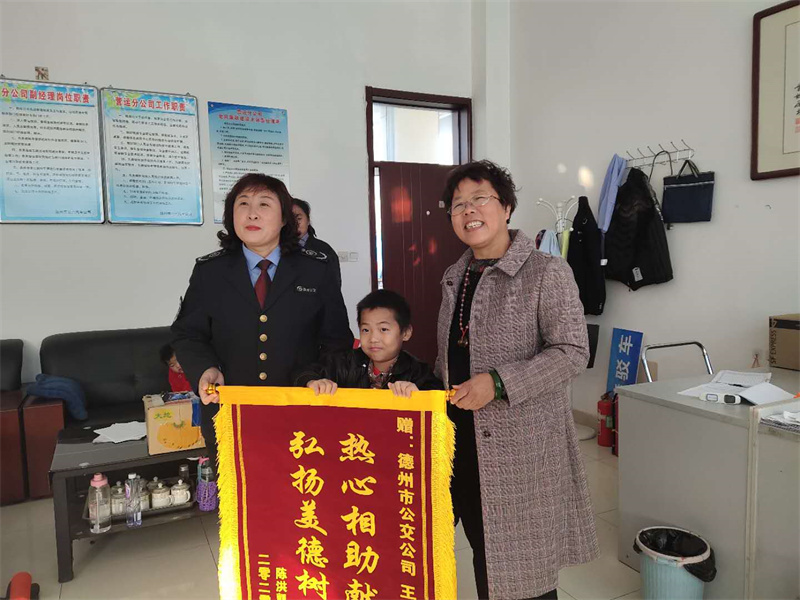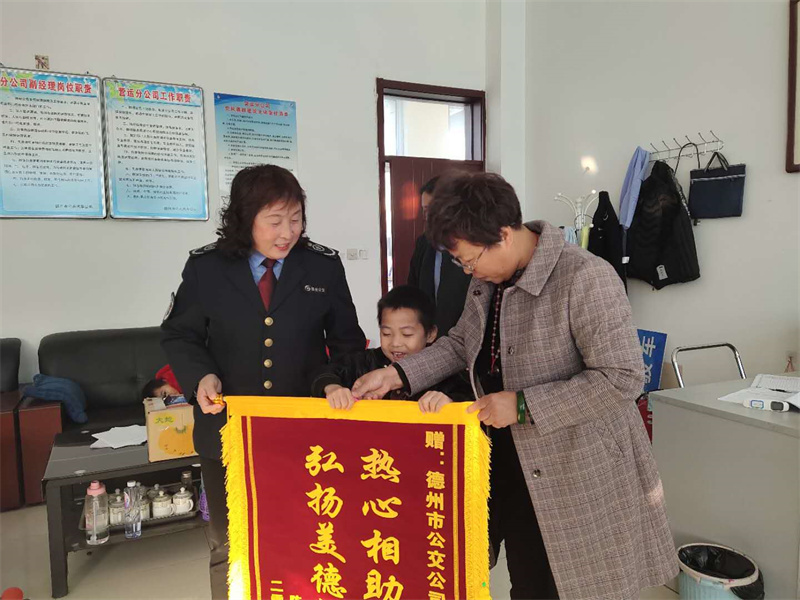 2020年11月2日上午,兩位市民帶著錦旗來(lái)到了德州公交二分公司辦公室,激動(dòng)的說(shuō)要特別感謝38路駕駛員王延玲幫助他們迷路的孩子安全回家。10月31日,孩子在銀座商城附近與家人走失,蹲在站牌處哭泣。38路駕駛員王延玲駕駛著公交車來(lái)到站牌,細(xì)心的她發(fā)現(xiàn)哭泣的孩子身邊并沒(méi)有人陪伴,便下車詢問(wèn)孩子為什么在這里哭,在與孩子家人取得聯(lián)系后,王延玲一直陪著孩子。許久,孩子的媽媽及家人急急忙忙的趕到了站牌處,見(jiàn)到孩子安全無(wú)事,激動(dòng)地說(shuō):“要是沒(méi)有這位司機(jī)師傅,我上哪去找你啊”??吹胶⒆优c家人團(tuán)聚,王延玲轉(zhuǎn)身要走,這時(shí)孩子的家人上前追問(wèn)他的姓名,但王延玲說(shuō):“這些都是我們應(yīng)該做的,同樣作為一名母親,守護(hù)孩子更是最基本的本能,現(xiàn)在孩子交到您手里我就放心了”,說(shuō)完她便走向了自己駕駛的38路公交車……