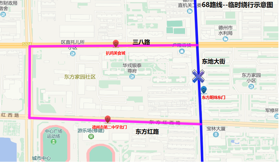 因東地大街(三八路至東方紅路路段)道路施工,即日起,68路線臨時(shí)繞行,具體如下: