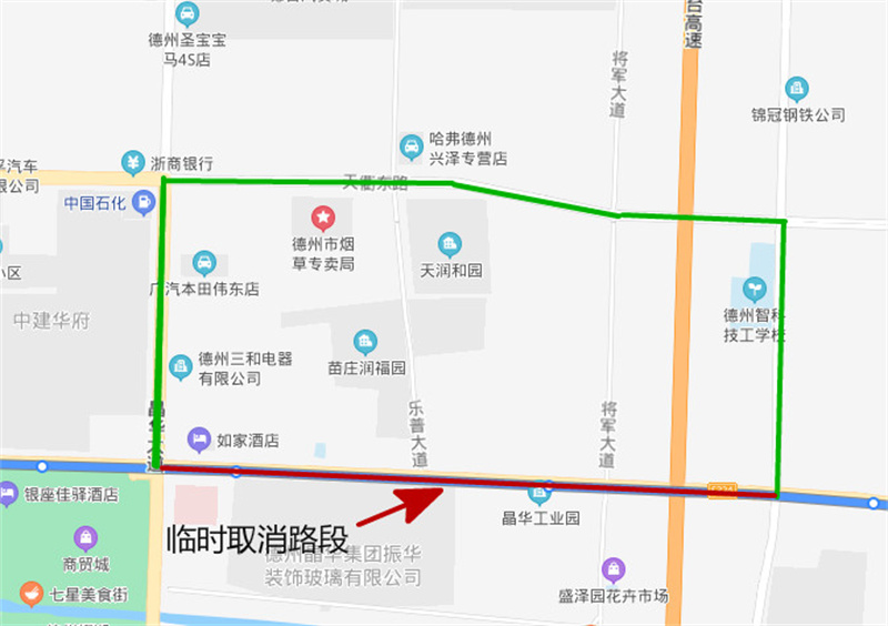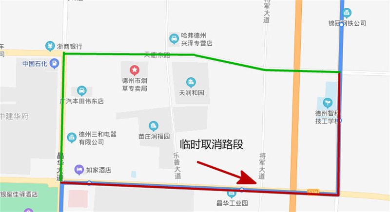 112路:火車(chē)站公交換乘中心發(fā)車(chē)沿原線路運(yùn)行至晶華大道,繞行天衢東路、崇德一大道、三八路,恢復(fù)原線路運(yùn)行至德州東站。臨時(shí)取消中建華府東門(mén)、三八東路晶華大道、三八東路將軍大道。