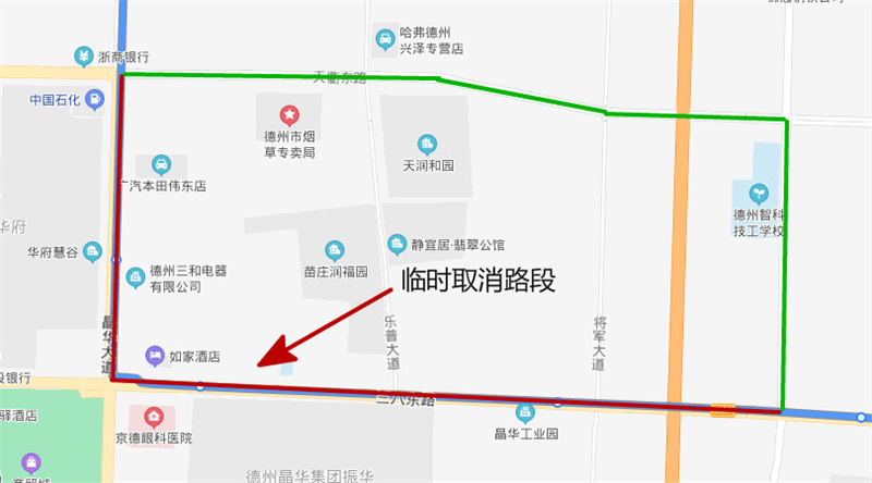 35路:德公館發(fā)車(chē)沿原線路運(yùn)行至晶華大道,繞行天衢東路、崇德一大道恢復(fù)原線路運(yùn)行至德州扒雞股份公司。臨時(shí)取消為三八東路晶華大道、三八東路將軍大道、凱元熱電廠西門(mén)。
