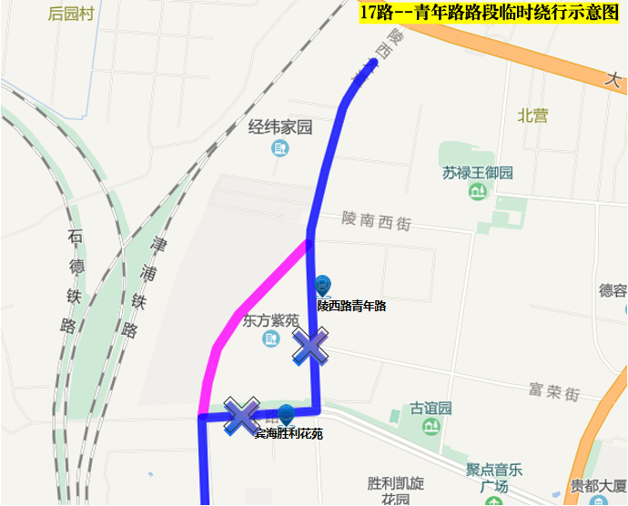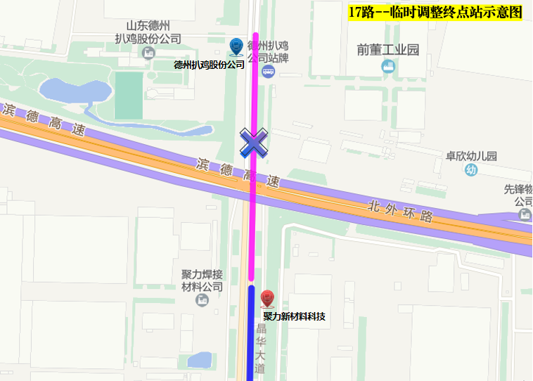 因晶華大道北外環(huán)(北側(cè)德州扒雞公司門(mén)口至南側(cè)橋下;南側(cè)聚力焊材大門(mén)北50米至橋下)道路封閉施工,不具備通行條件。即日起,17路在原繞行基礎(chǔ)上臨時(shí)調(diào)整終點(diǎn)站至聚力新材料科技,具體如下: