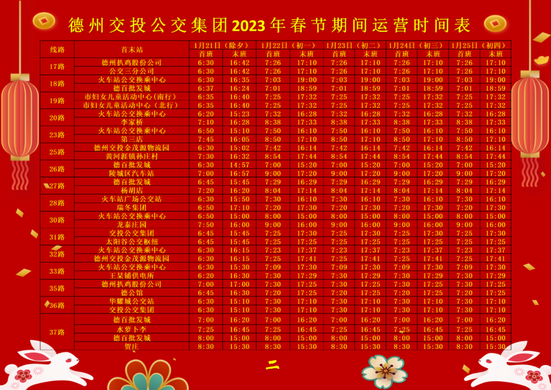 春節(jié)將至,結(jié)合居民出行情況,德州交投公交集團將于2023年1月21日(農(nóng)歷除夕)-1月25日(正月初四)對公交線路運營時間進行適時調(diào)整,具體如下: